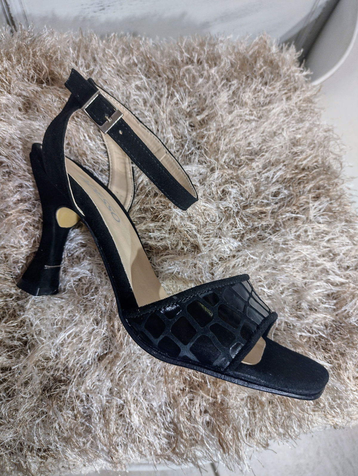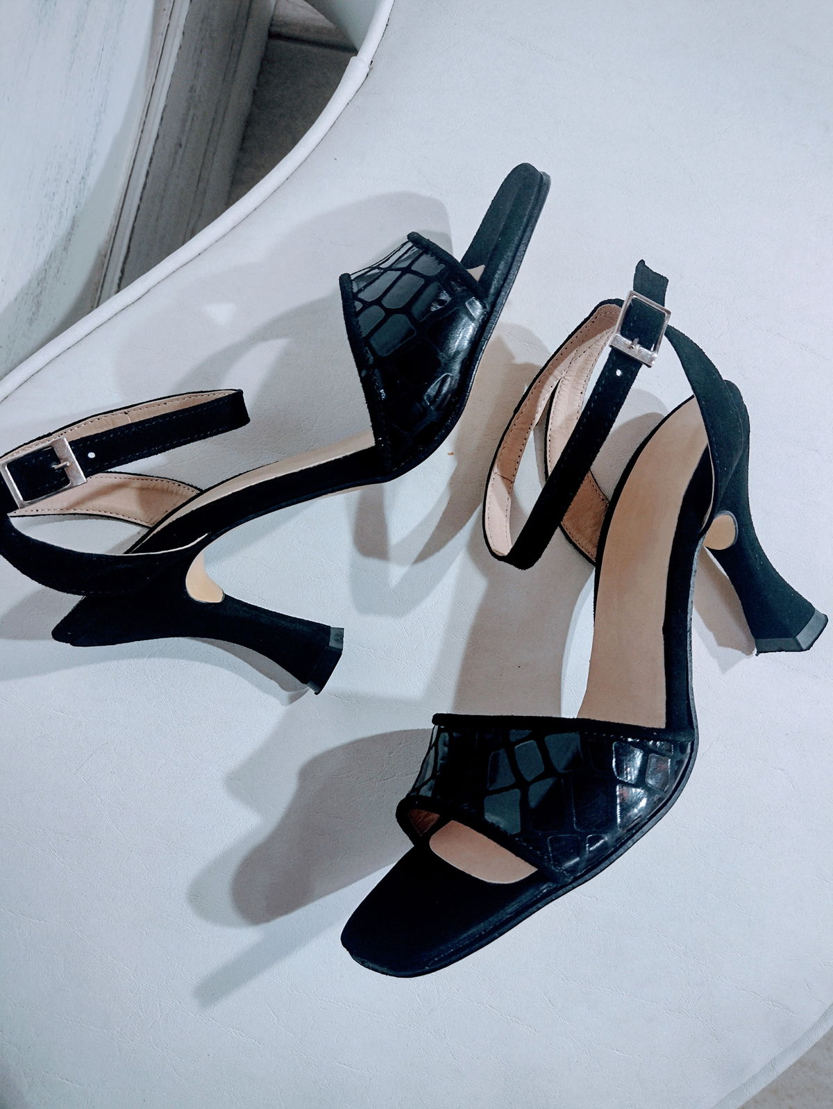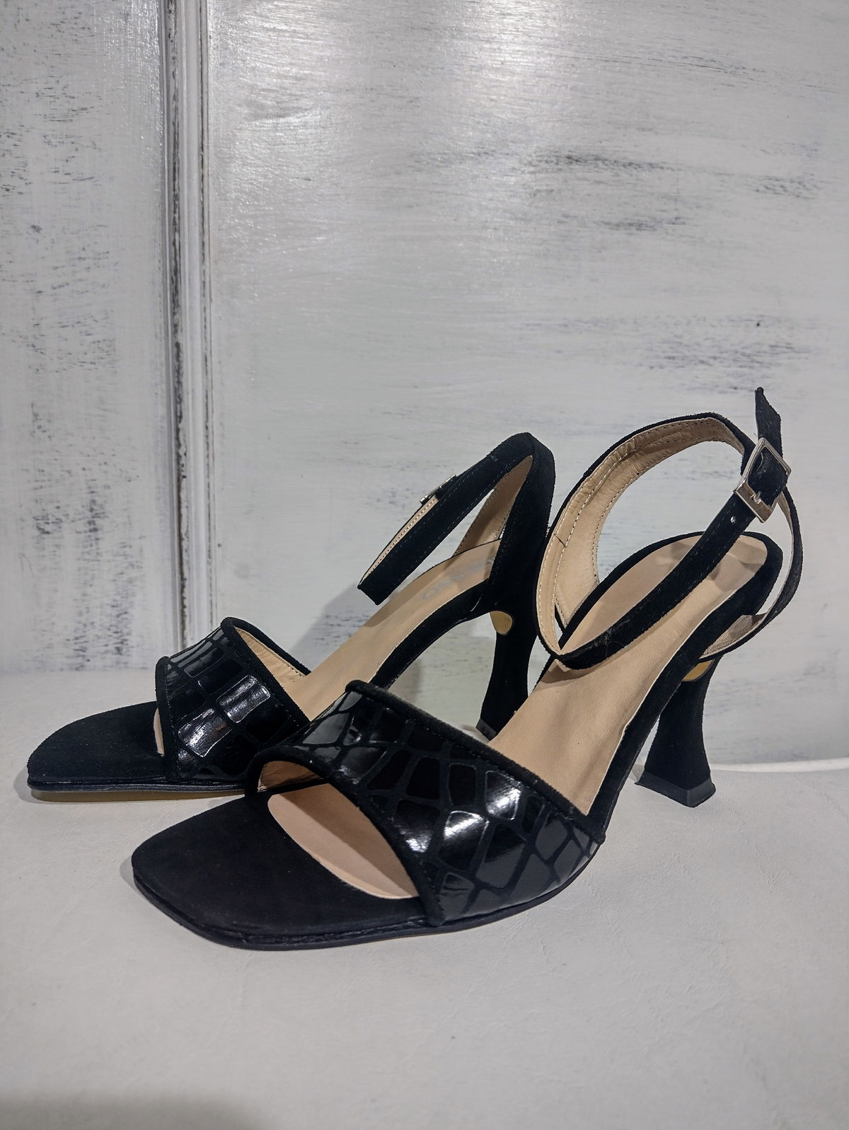 Exterior cuero gamuzado.y croco. Interior cuero. Base Pu.taco 8cm. Punta cuadrada.