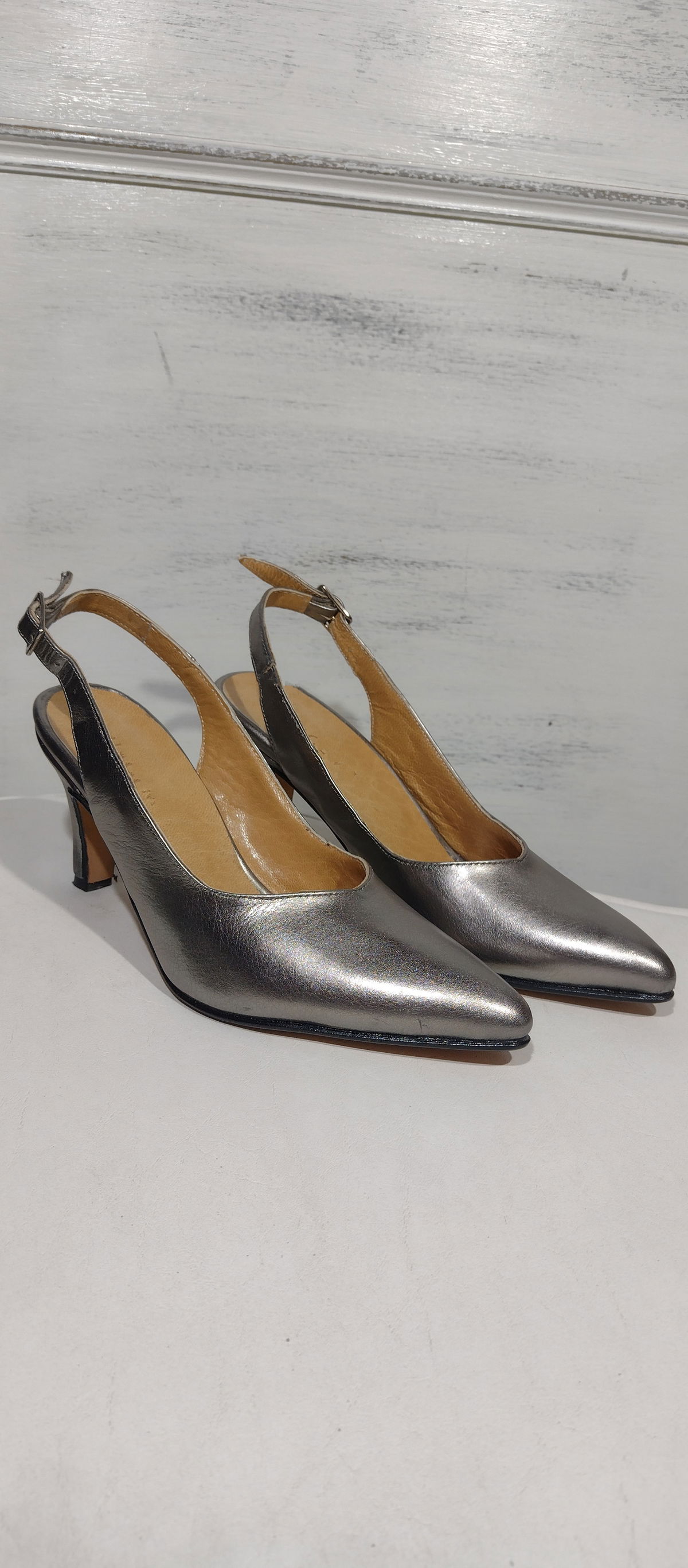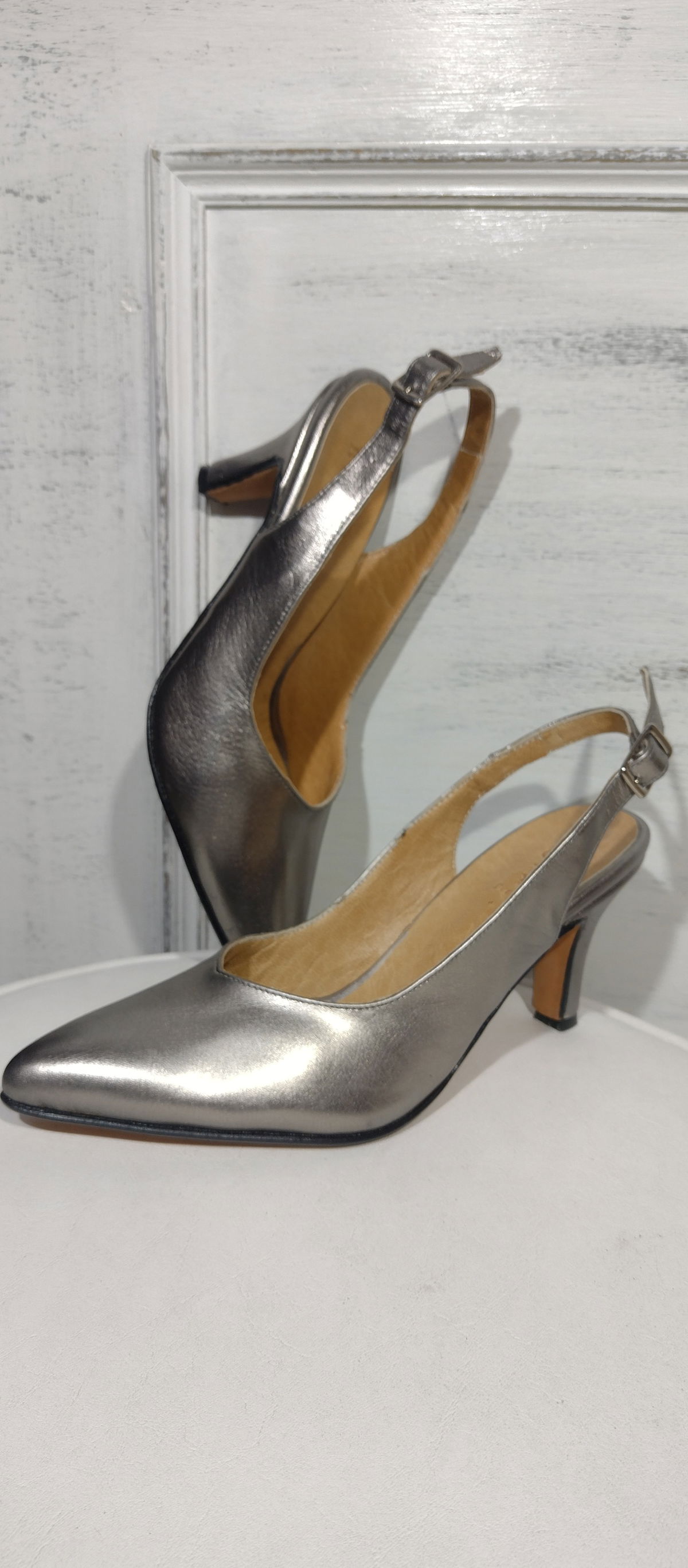 Detalle: interior cuero carretilla. Exterior cuero vacuno liso. Base en suela, taco 7,5 cm. El pie no llega a la punta ,la capellada es alta lo que lo hace cómodo, con tira al tobillo brindando seguridad.