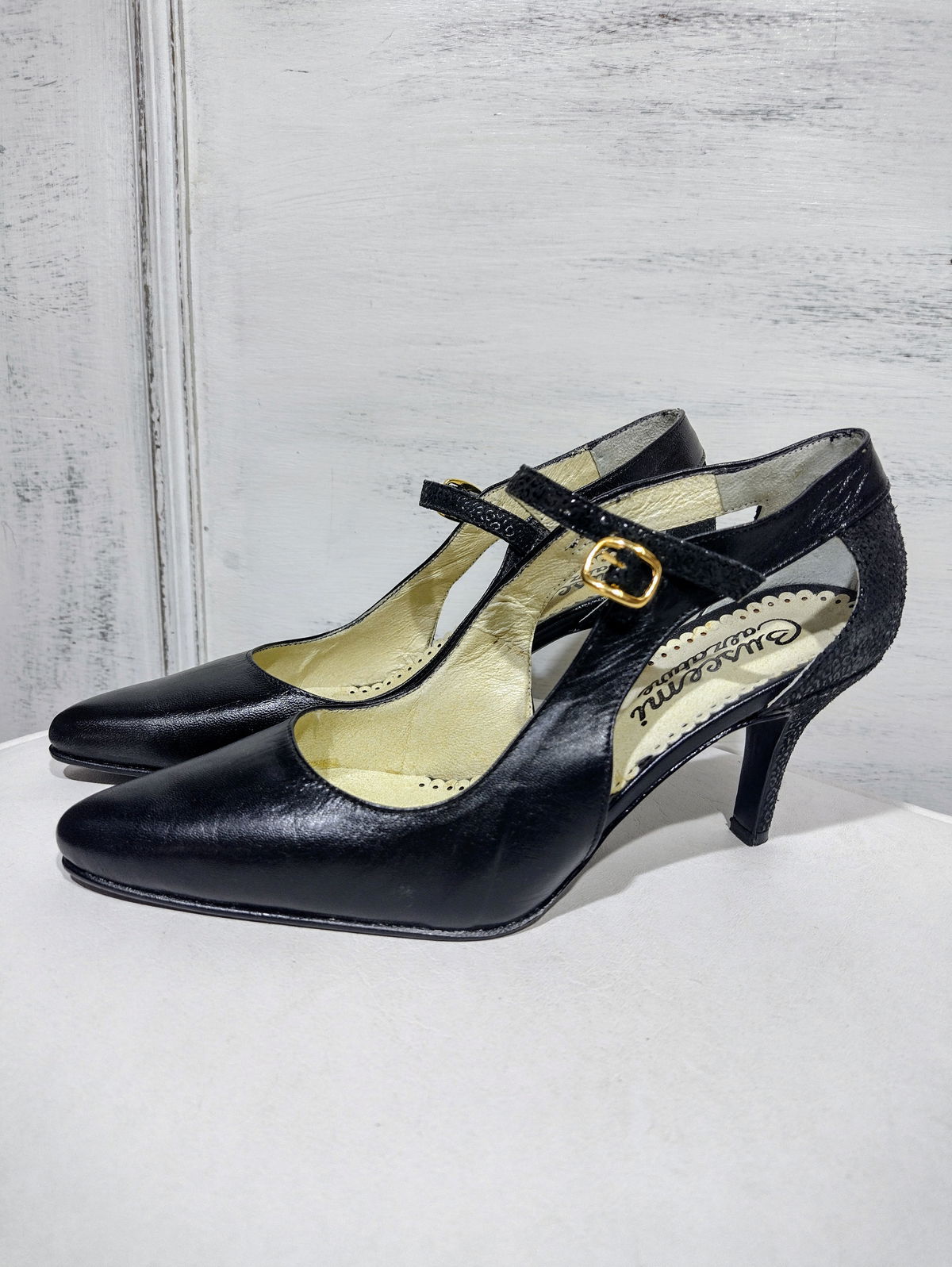 Interior: cuero de carretilla. Exterior: cabrito lustrado, con detalles de cabrito fantasía. Base de suela. Taco 7 cm.