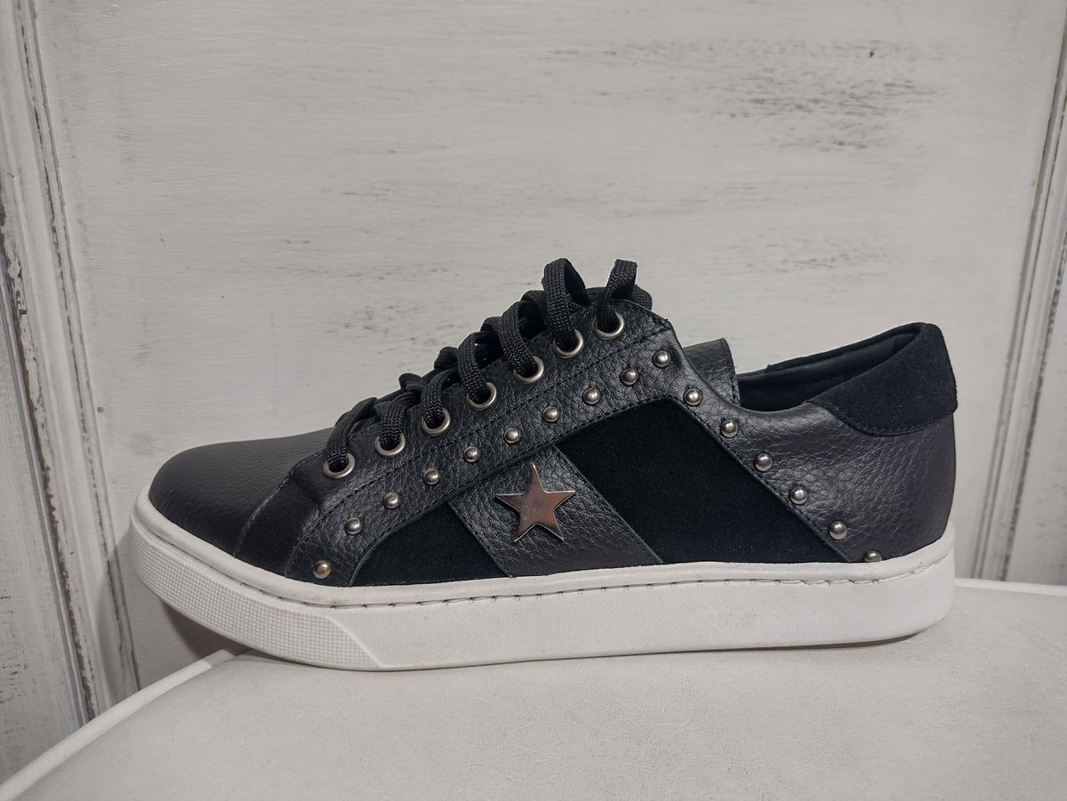 Interior : cuero vacuno. Exterior: cuero vacuno y cuero vacuno gamuzado, tachas y estrella de acero. Base tr, cocida .